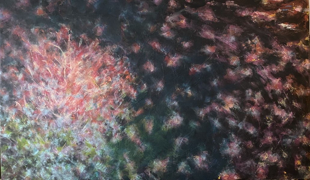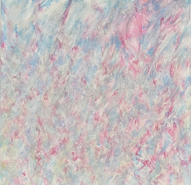 "Natural Abstraction" breathes light and air. Delicate layers of pink, blue, and white float across the surface like flowers and mist, creating a gentle diagonal flow that guides the eye. The limited palette is used with confidence; translucent layering and soft texture build depth while keeping the image luminous. Conceptually, the work translates nature into a feeling rather than a depiction, which feels fresh and poetic. The mood and rhythm work particularly well: the brushwork is delicate but energetic, giving the work a calm presence that still feels alive and growing.